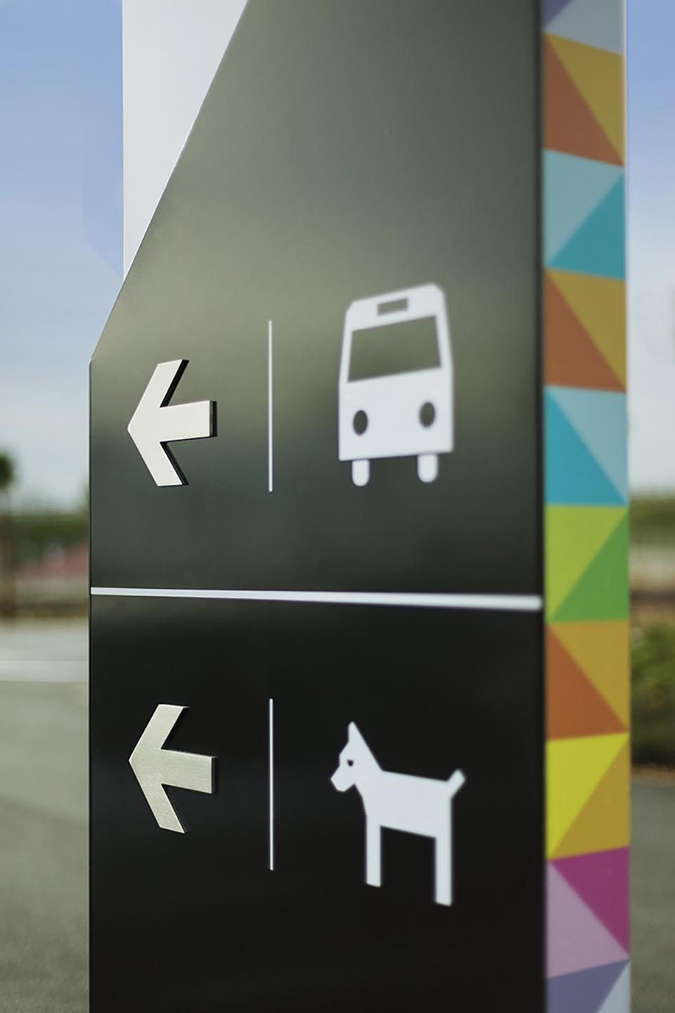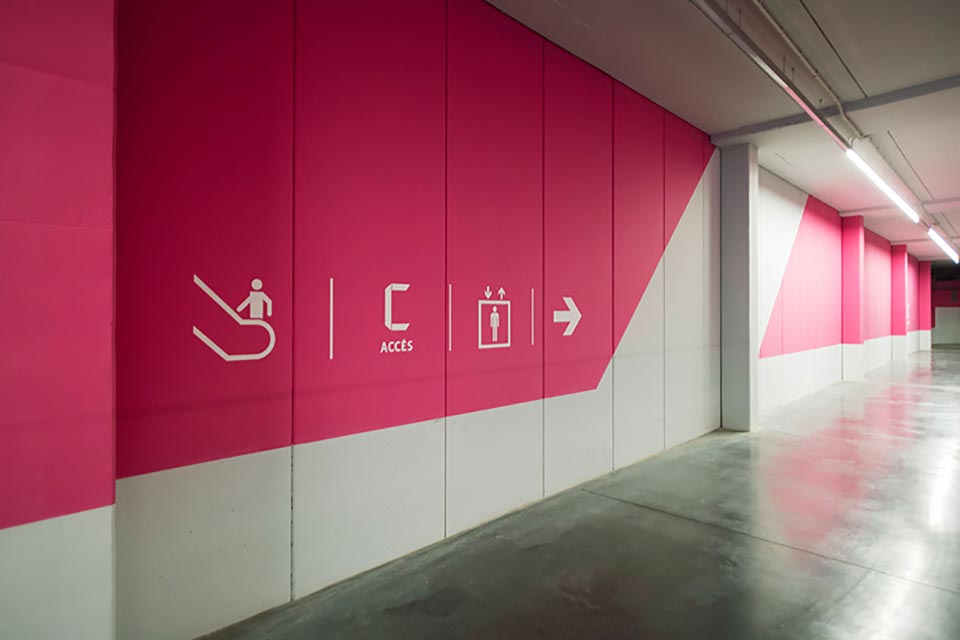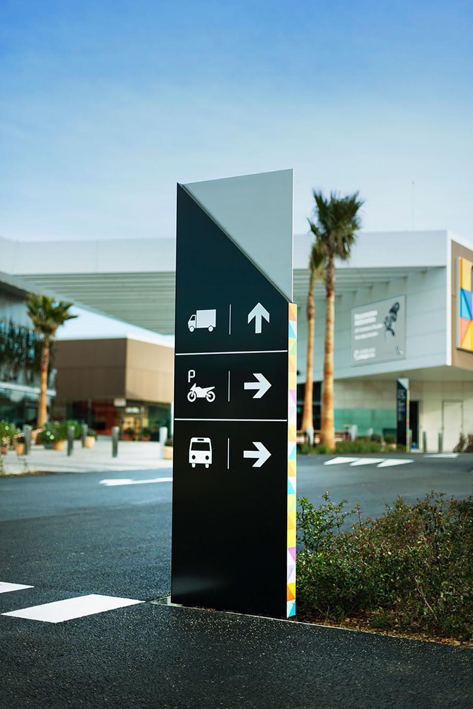 ViladecansStyle Outlets購物中心是歐洲知名門店品牌。集購物、娛樂和休閑的結合體,以提供購物者度過美好的一天所需要的一切。該項目的目的在于將標識系統和圖形自然地融入到建筑空間中,為特定的指導需求提供解決方案。Mayúscula設計工作室基于現有視覺標識,將帶有不同中心的色彩的三角形視為主要元素,并將其應用于所有的標牌系統設計中,使空間本身被作為展現品牌身份的一部分。