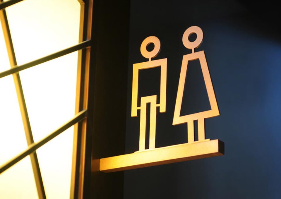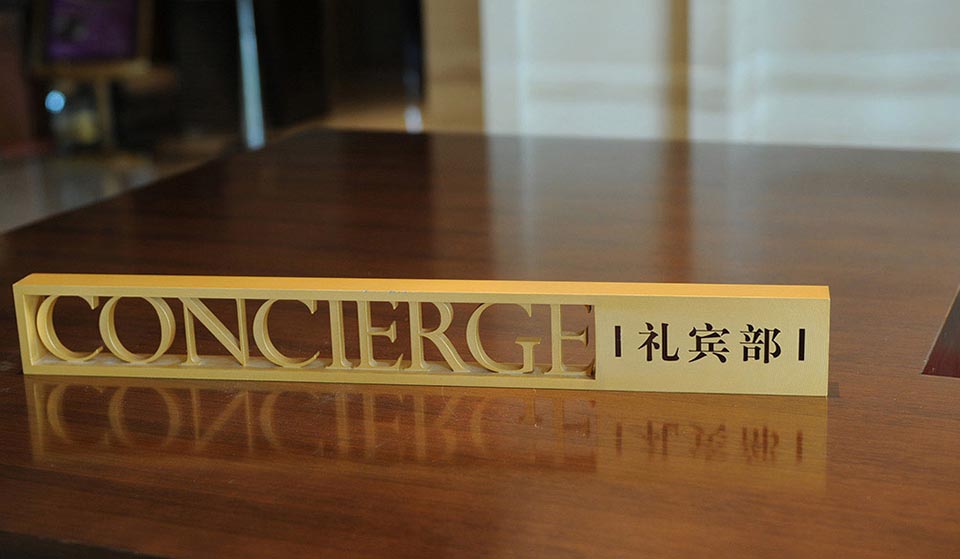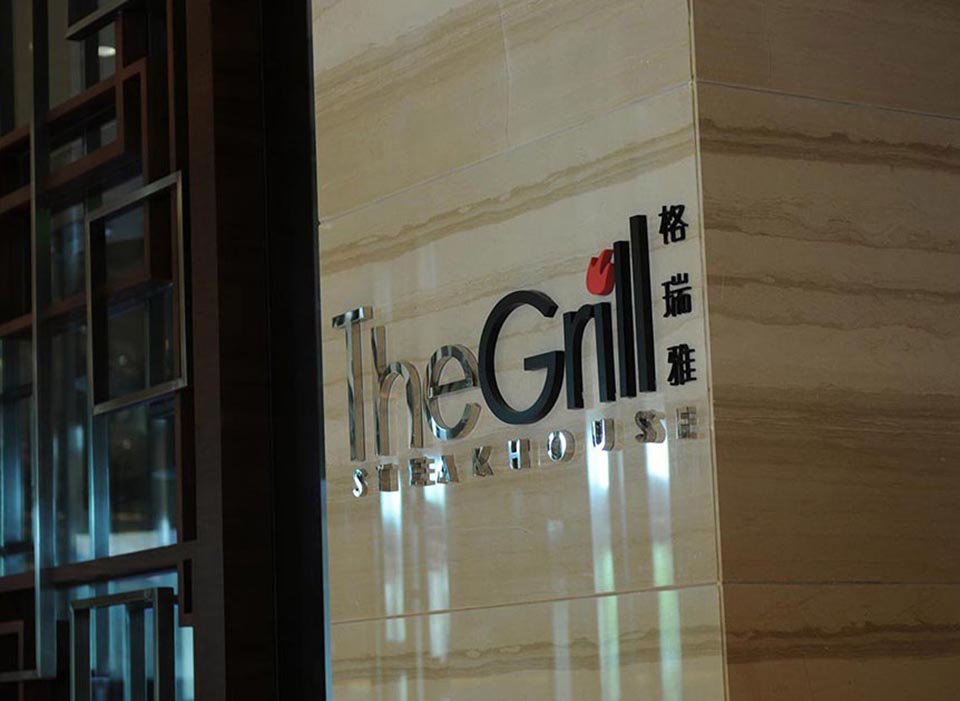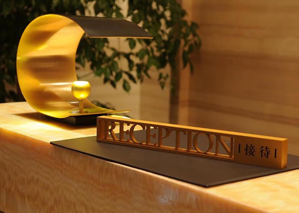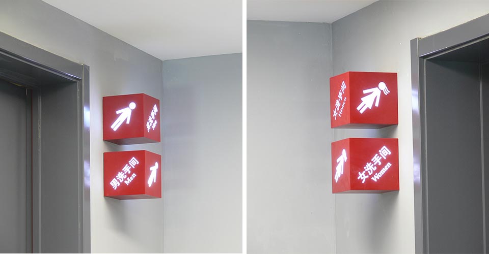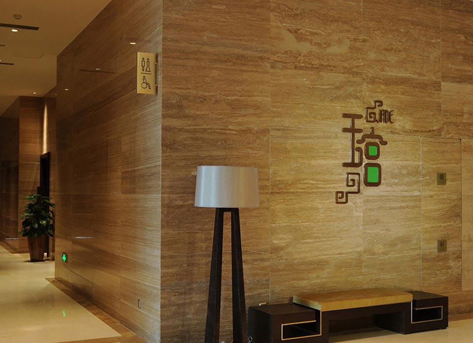 案例四,合肥皇冠假日酒店導視設計材料上采用不銹鋼噴砂處理,形式上結合精裝中式窗欞的元素,采用局部鏤空的工藝,總體上簡約、大方、體現現代中式奢華的風格。