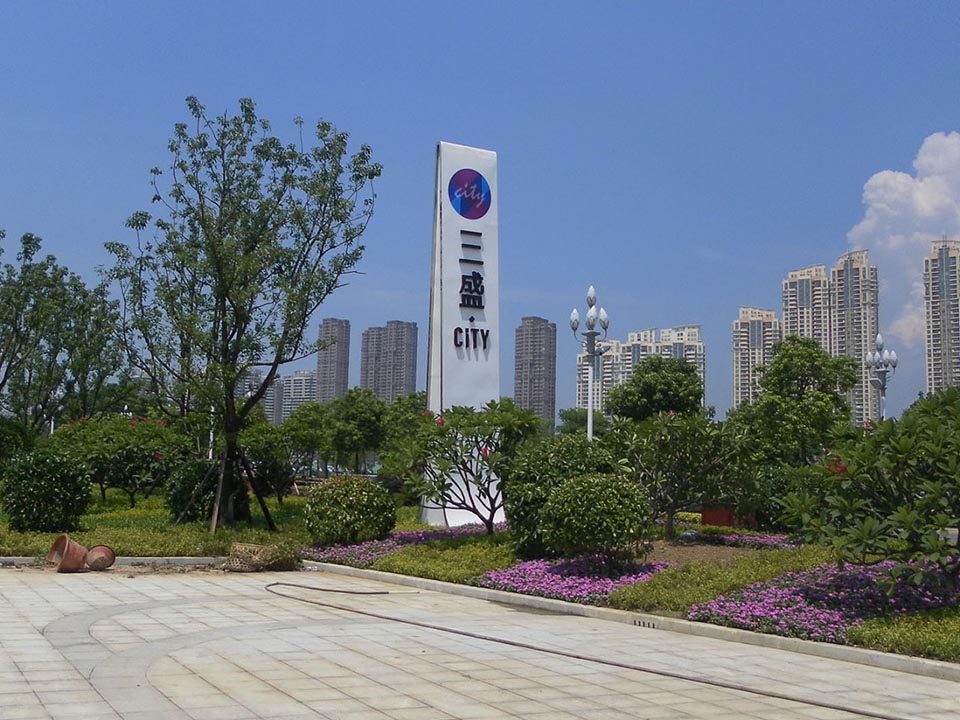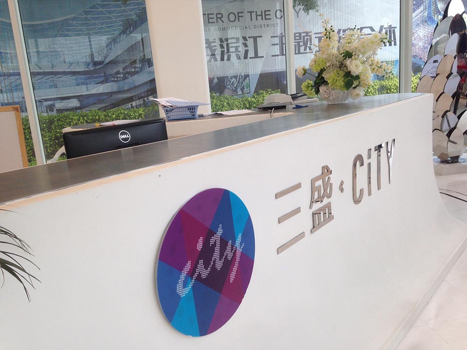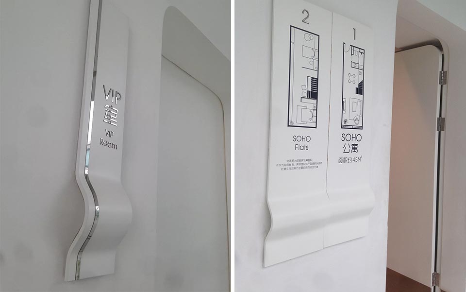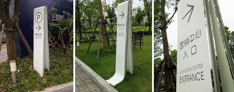 案例三,福州三盛廣場售樓中心導視設計靈感來源于建筑水流動的概念,標識與靈動曲線結合。