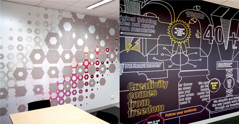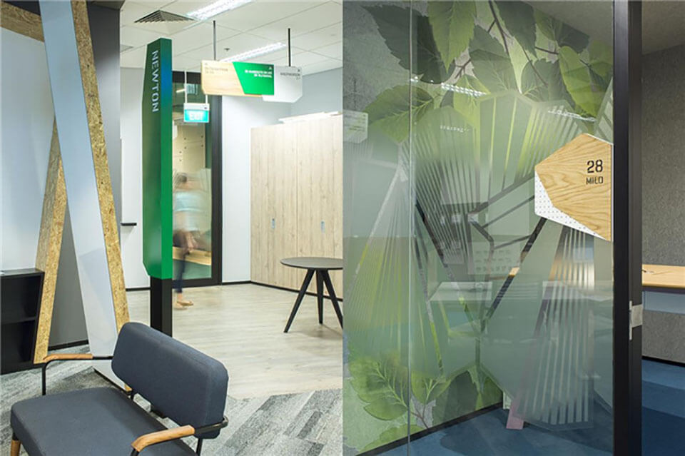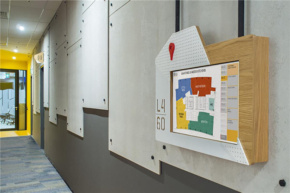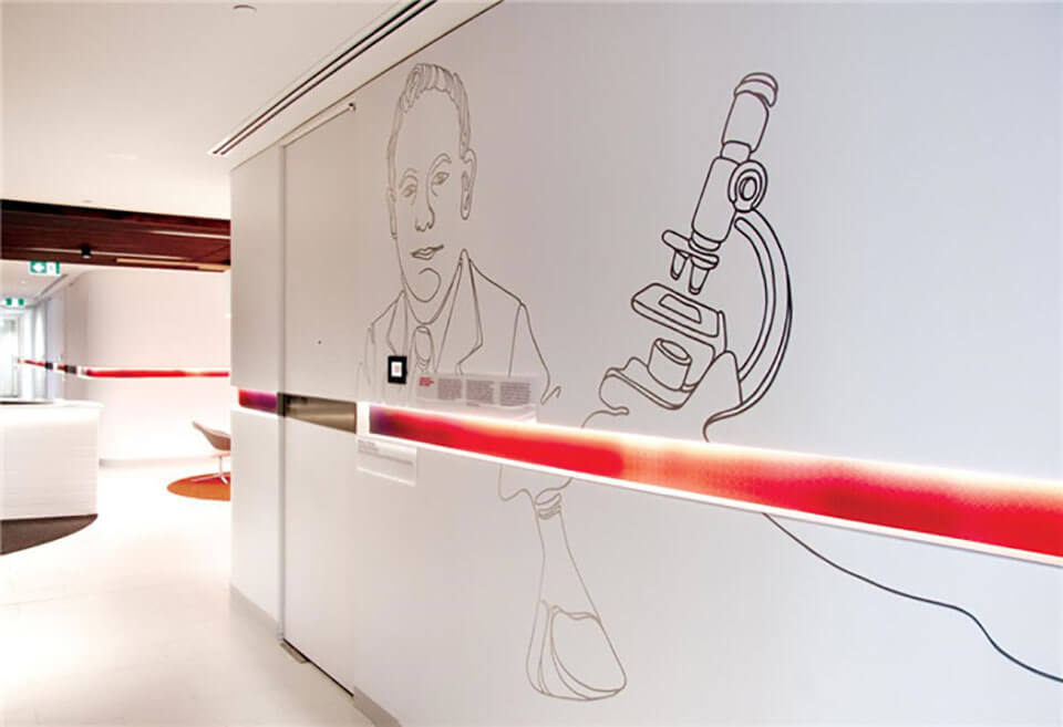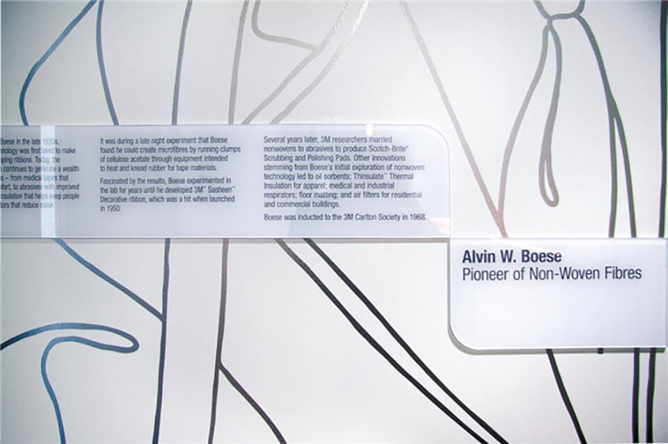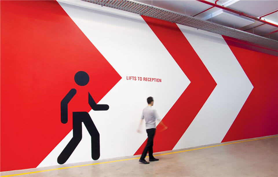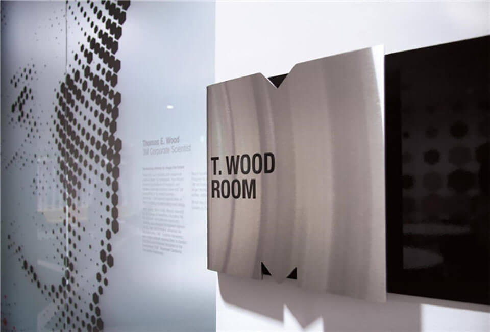 3M公司以創(chuàng)意聞名全球,因此設計要能抓住3M的品牌精髓,辦公室的環(huán)境設計要能傳達出3M深層的創(chuàng)意文化核心。80平方米的時間表浮雕和墻面大型的人物插畫代表了3M輝煌的過去以及對前輩改革家與發(fā)明家的致敬。THERE公司為五個樓層分別繪制了不同的主題,這些不同的圖形設計不僅豐富了空間視覺,帶來強有力的視覺沖擊,還娓娓述說著畫面背后所蘊藏的故事,營造出一個獨特的文化體驗空間。 該項目的導視設計也與整體環(huán)境風格相融合。